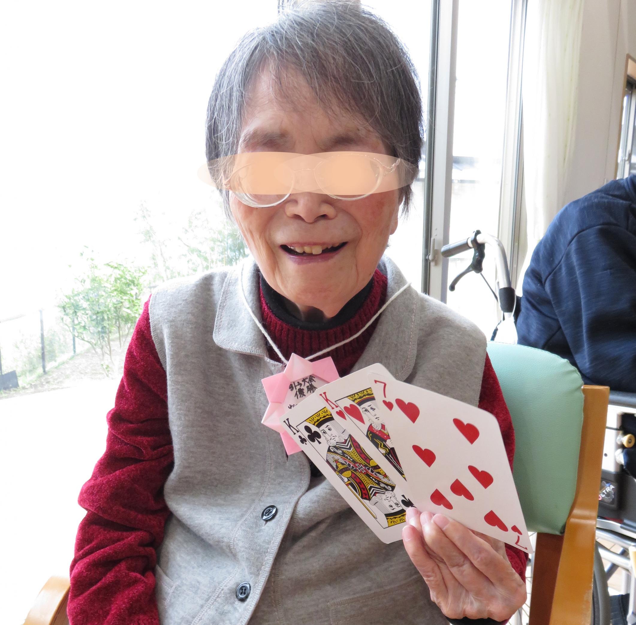 デイサービスCANでは、誰もが主役になれるように集団レクリエーションを楽しんで頂いております。本日の種目はサントラ。これはトランプポーカーの変則遊び(デイサービスCANオリジナル)です。ひとり1枚づつ3回引き終わるまで行い、今回は引いた数の和が最も大きい(小さい数が優勝になる設定の時もあります)ひとが優勝となります。特別ルールでスリーカードは+10点、ワンペア+3点、ストレート+3点、フラッシュ+3点となりますので、今回の優勝得点は36点といった大記録でした。 ![]() |
