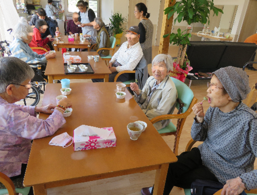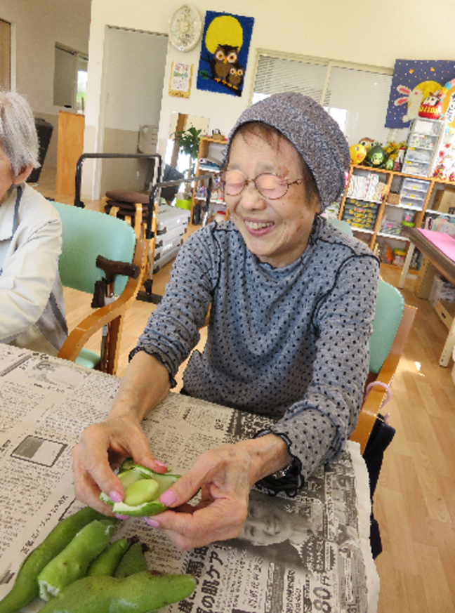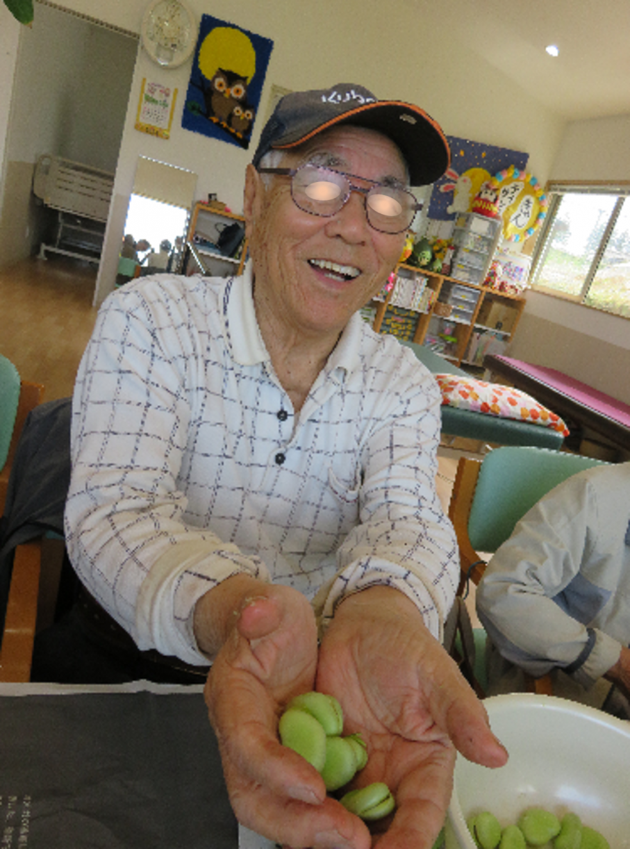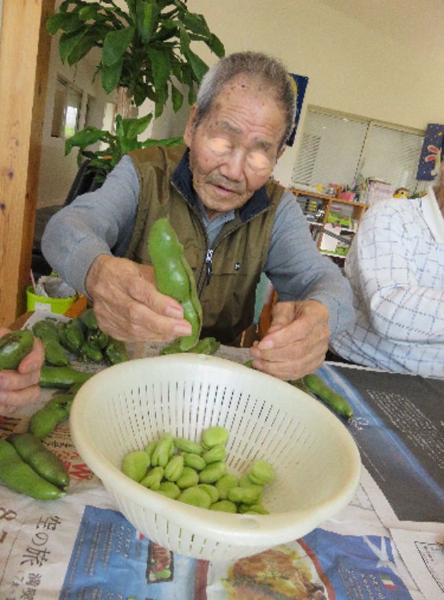 そら豆を収穫して、塩ゆでにしていただきました。 4月6日のブログ「キャベツの和え物」では、 ![]() 『デイサービスCANの菜園も天候不良の影響を受けています。「そら豆」は2月中旬の暖かさで、例年より一カ月早く小さなまま花をつけてしまいました。3月中旬以降の気温低下や降霜があり対策が必要でした。また、強風(東京ではトラックが横転するほどでした)の影響も数日あり、枝折れや花落ちの被害がでました。なんとか、たくましく育っています。』と、お伝えしていました。 ![]() ![]() ![]() ![]() ![]() ![]() ![]() ![]() ![]() ![]() 収穫や皮むきでは普段の日常生活では見られない表情や活動力を見せて下さる方もおられました。3時のお茶のひとときが「はつもの」「おいしい」「おかわり」などの声と笑顔で賑わいました。