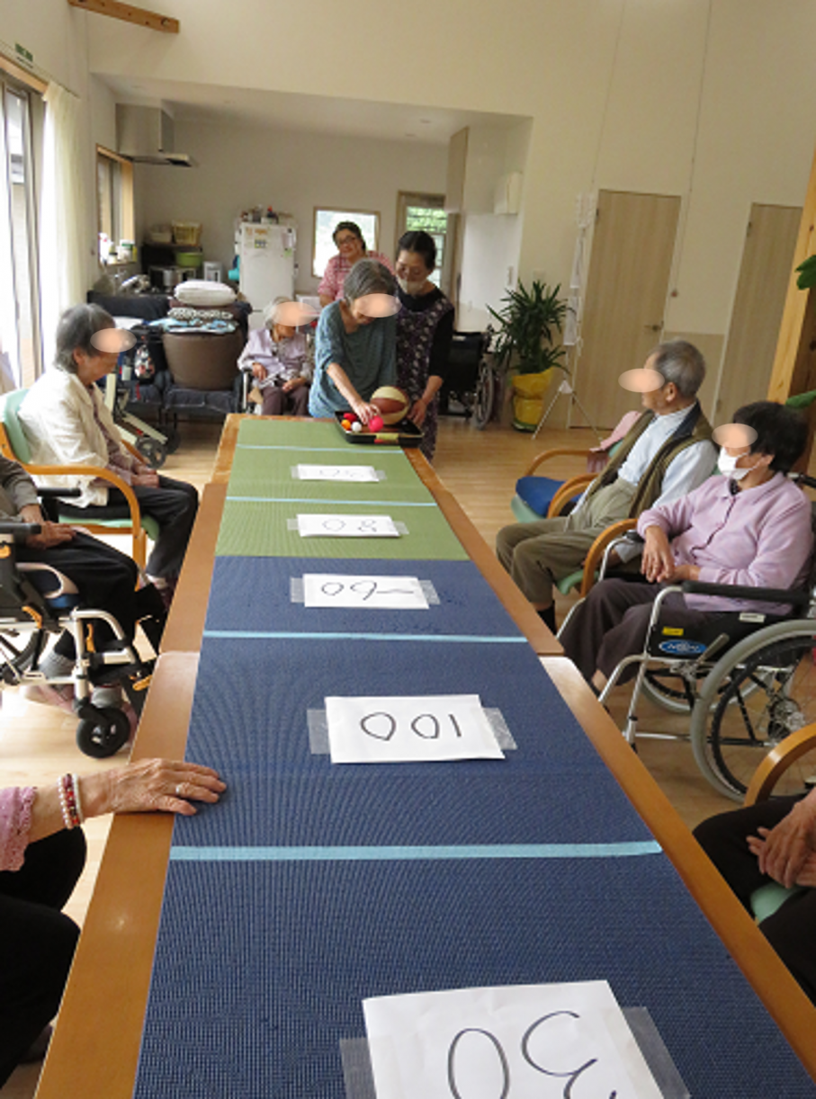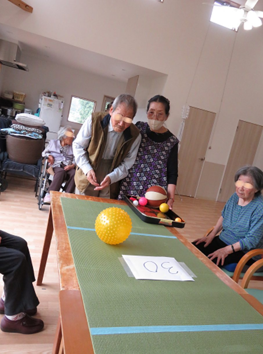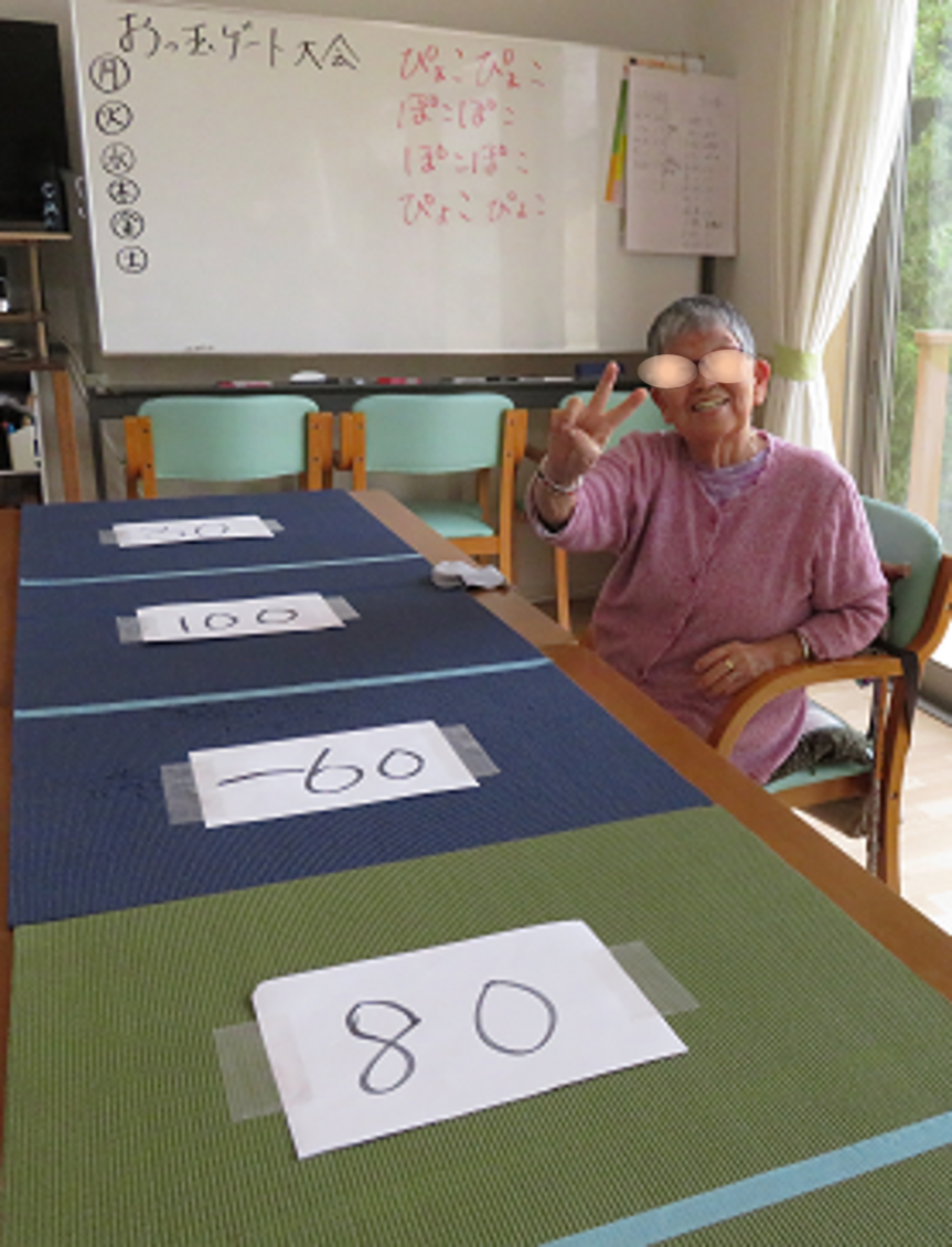 デイサービスCANでは、誰もが主役になれるように集団レクリエーションを楽しんで頂いておりますが、今週のレクリエーションは「おっ玉ゲート」。テーブルを繋げた卓上にヨガマットを敷き、手前から先端まで6つのゲートで仕切られた領域に得点が表示されます。参加者はボールやお手玉など数種類の中から3つだけ玉を選び、高得点を狙ってゲートを通過させるオリジナルゲームです。 ヨガマットに残った玉が得点になりますが、高得点の手前にはマイナス得点もあります。投球者の力加減や玉との相性が勝負を左右します。本日の優勝者は初めてのメダル獲得となり、手踊りも飛び出し喜びを表現されました。 ![]() ![]() ![]() ![]() |