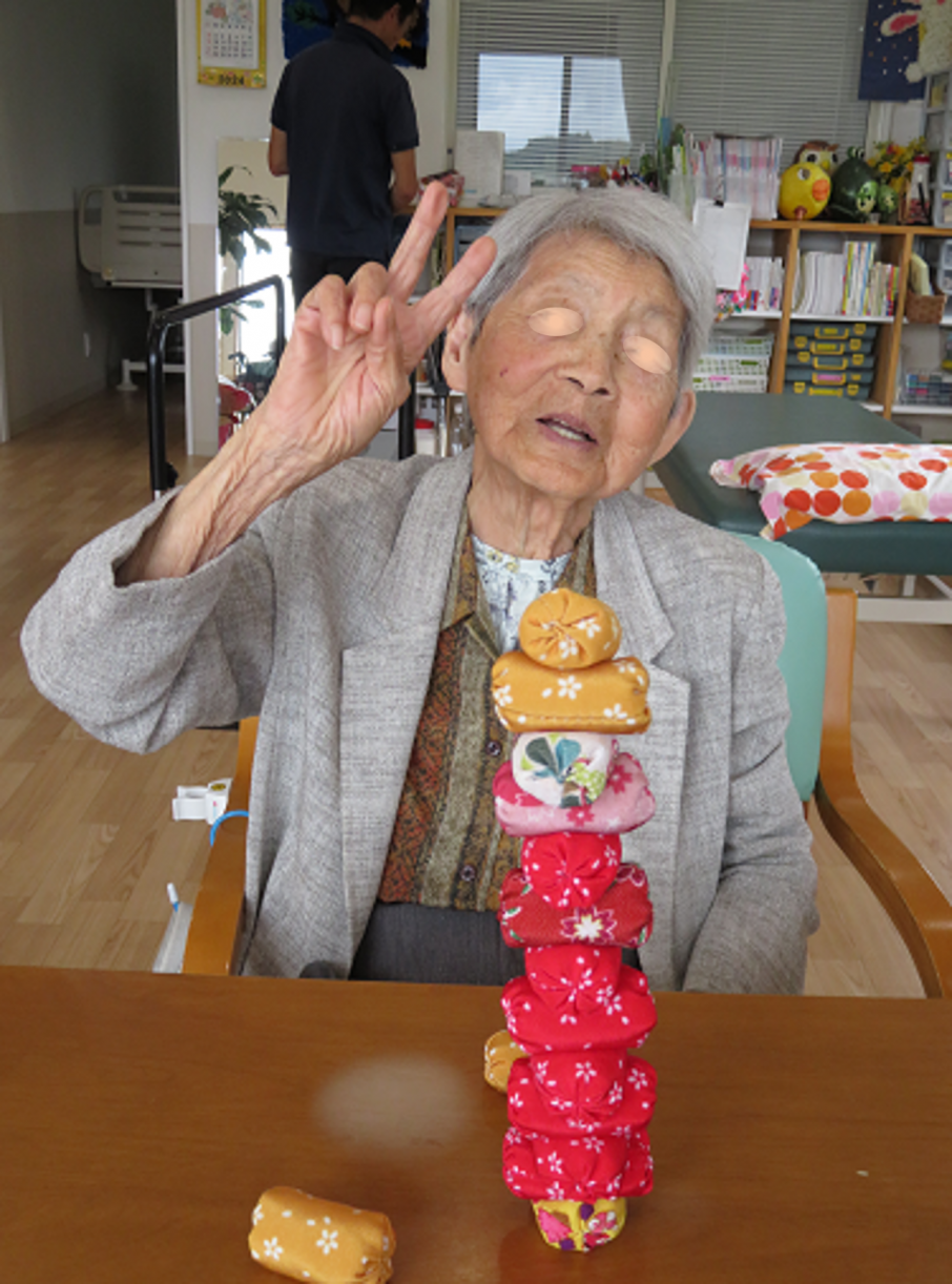 お手玉積みに挑戦し、これまでの3月23日に新記録10個、4月3日に新記録11個、6月1日に新記録12個を達成された方が本日新記録13個を達成されました。今回も96歳での挑戦で新記録達成、おめでとうございます。 ![]() |
