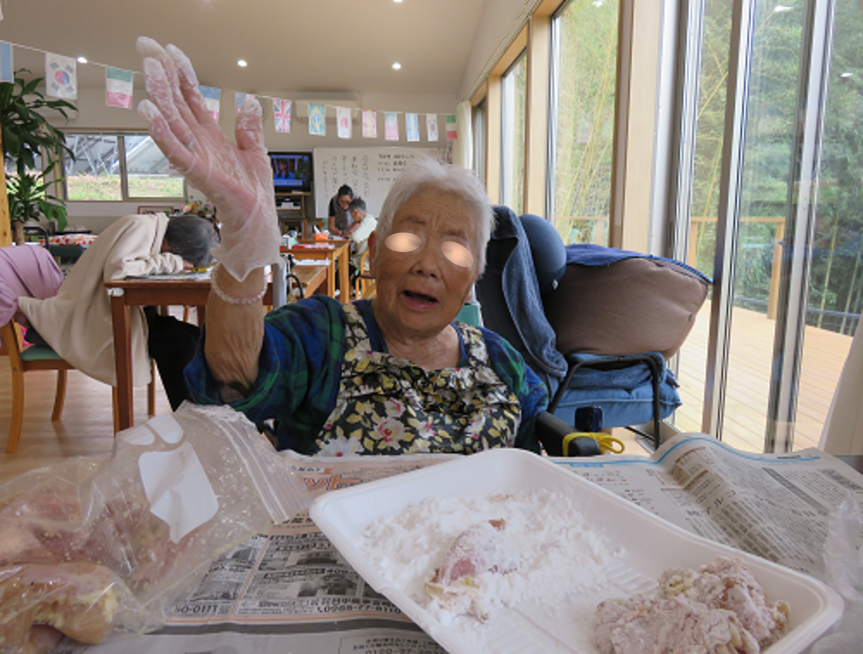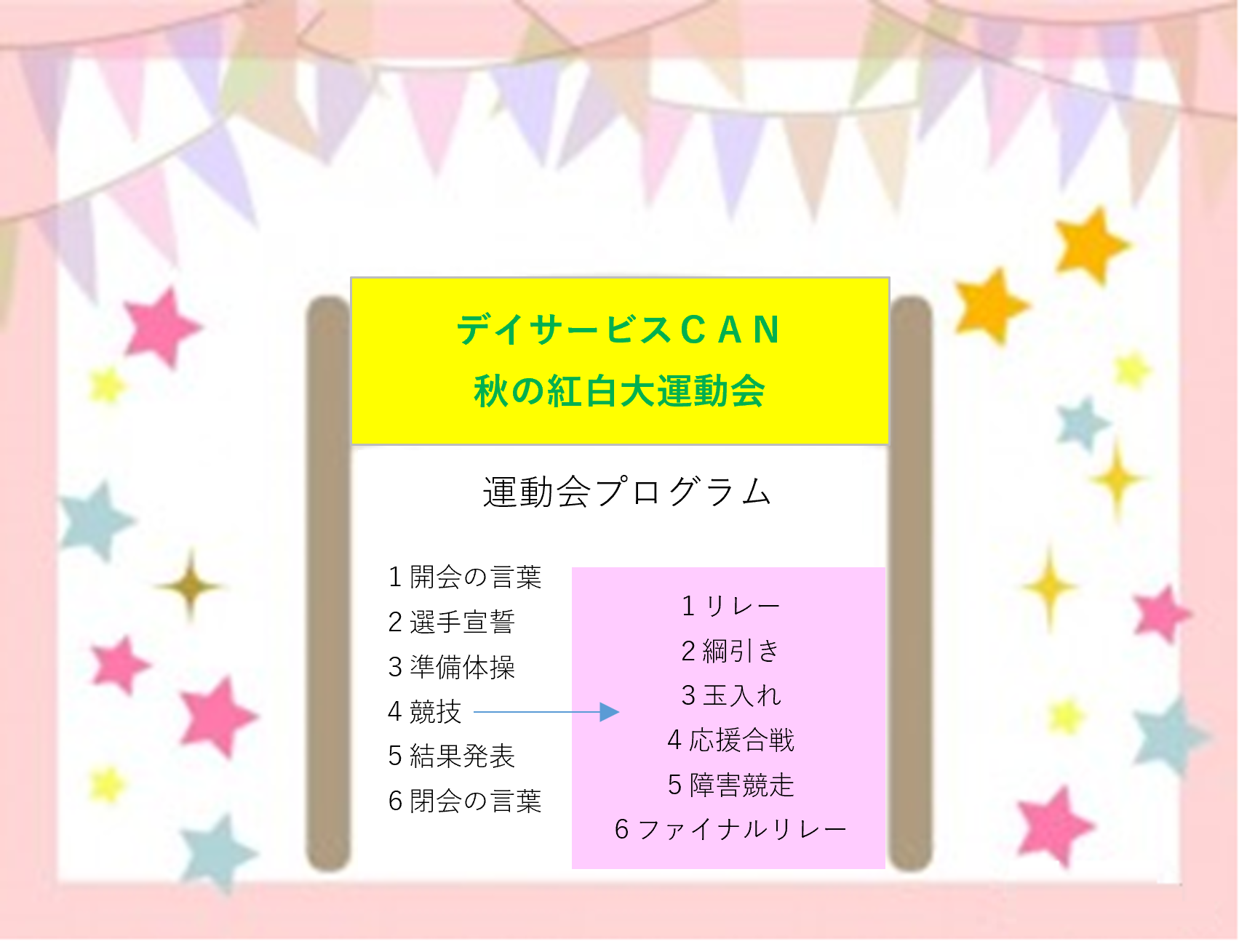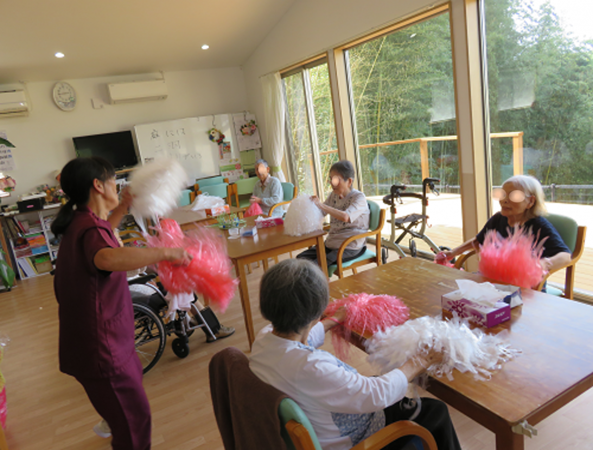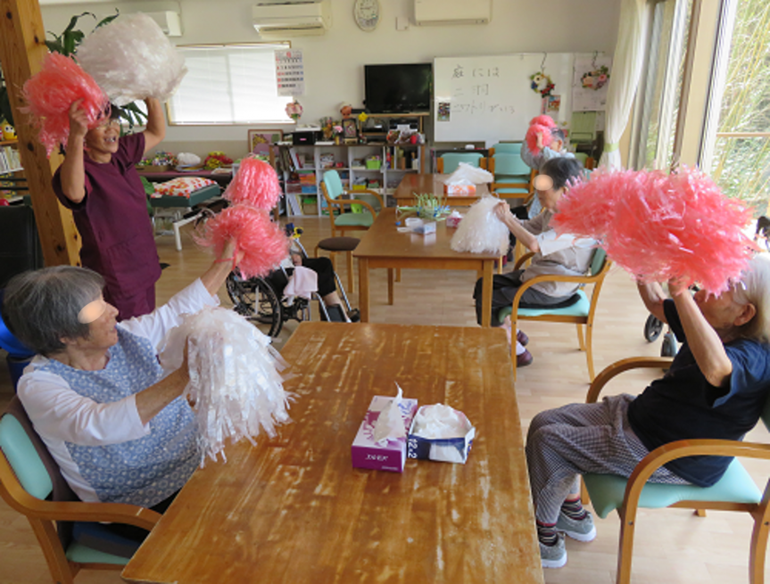 10月14日は「スポーツの日」でした。そこで、16日と17日の2日間に渡り「デイサービスCAN 秋の紅白大運動会」が開催されました。 運動会と言えばお弁当の話に花が咲きます。ある日「どうせなら弁当どん作っせ外で食ったらうめやろね」という声をいただくことができました。そこで今回は初の試みで「お弁当作りと昼食会」が運動会行事に追加されました。今月の運動会までの2週間は、集団レクリエーションの時間を活用し準備や競技の練習を行い当日を迎えました。 ![]() 事前準備や練習 競技種目5の障害競走は、輪投げが入ったら足で紐をたぐり、ペットポトルを引き寄せる速さを競います。このような内容が複雑なものは事前練習を行いました。応援合戦で用いるボンボンも皆でつくり、3・3・7拍子など応援の練習にも笑顔が溢れました。また、ファイナルリレーではスタッフが車椅子で変装をしますが、その小道具で愉快な雰囲気となりました。 ![]() ![]() ![]() ![]() ![]() ![]() ![]() ![]() ![]() ![]() ![]() お弁当作り、昼食会。 お弁当のメニューは事前の協議により「おにぎり・から揚げ・ソーセージ炒め・卵焼き・煮もの(卵とコンニャク)・梅干し・お漬物・味噌汁」になりました。味噌汁の具に畑で収穫された里芋と保存されている玉ねぎを使いました。雨天のため屋外での計画は見合わせることになりましたが、楽しい昼食会になりました。 ![]() ![]() ![]() ![]() ![]() ![]() ![]() ![]() ブログ更新して運動会の状況をお伝えしたいと思います。 お楽しみにお待ちください。 |